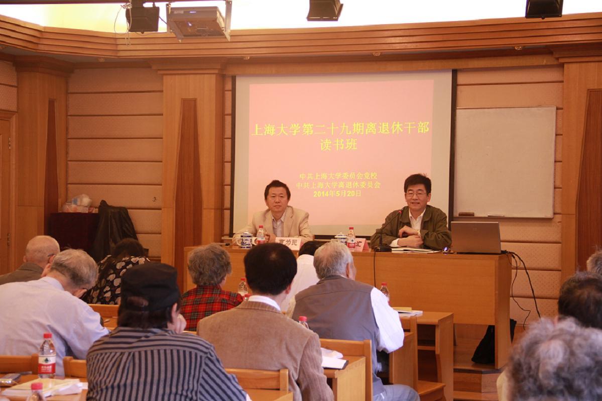 于信汇书记首先围绕我校半年来开展的主要工作和老同志进行了深入交流。包括我校将迎接本科教育教学的审核评估工作,我校研究生培养改革工作,我校在积极准备实施上海市本科教学教师能力提升计划,延长校区功能调整的相关工作和我校学科建设的一些情况。于书记全面深入的解读,让老同志们更加详细了解了学校目前的发展情况,使老同志们在了解的基础上更加关心和关怀学校的发展。此次读书班还邀请了唐豪副校长作了题为《延长校区功能转型与未来发展的展望》的报告,唐校长用生动的语言向老同志们介绍了我校延长校区整体规划的推进情况、面临的问题以及给我校带来的机遇和挑战,满足了老同志们关心学校发展的心声。下午,我校社科学院副院长、全国教学名师李梁为大家带来了《国际形势与中国外交的战略新思维》的精彩报告。他从国际形势与中国的外交新局、近年来中国外交战略的调整以及我国新领导班子的外交特点三个方面,结合丰富的史实和案例,进行了精辟的剖析解说,把我国面临的挑战和机遇,我们国家正在用智慧和实力笑傲国际的成就向老同志们进行了介绍,效果令人振奋。